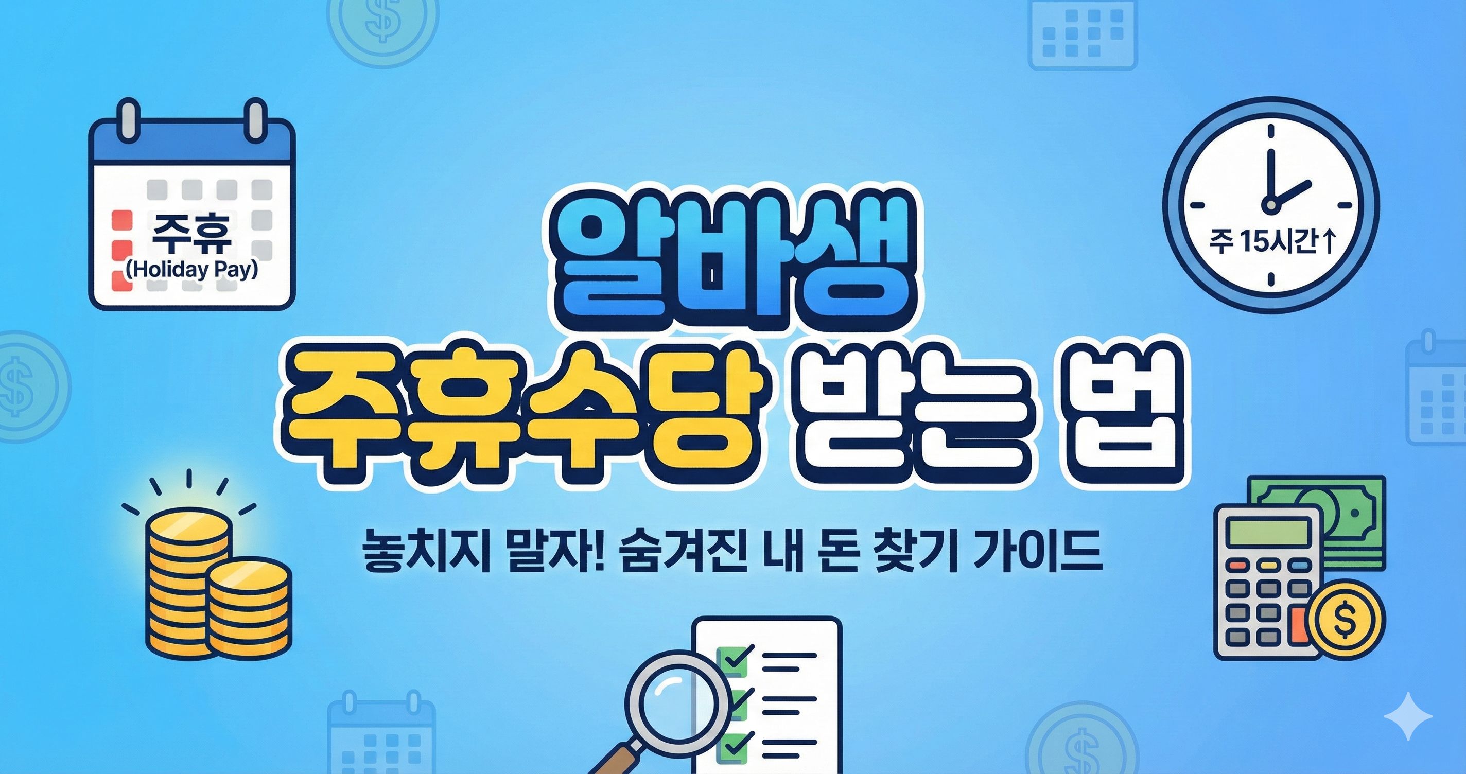 "주휴수당이 뭔가요?" "알바도 주휴수당 받을 수 있나요?" 많은 근로자들이 주휴수당에 대해 잘 모르고 있습니다. 이 글에서는 주휴수당의 개념부터 계산 방법, 자주 묻는 질문까지 한 번에 정리해 드립니다.